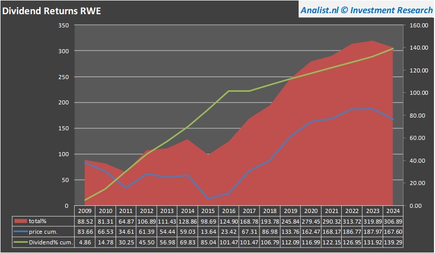 Het lijkt er op dat beleggers in het aandeel RWE waarschijnlijk een aanzienlijk dividend in het vooruitzicht hebben. Op basis van de recente analistentaxaties koerst het aandeel RWE tot één van de aandelen met de hoogste dividendrendementen van de Duitse beurs. Over dit jaar ligt de taxatie van het dividend op 1 euro. RWE 's dividendrendement komt neer op 3.18 procent. Het gemiddelde dividendrendement van de energiesector ligt op een aantrekkelijke 3.33 procent.