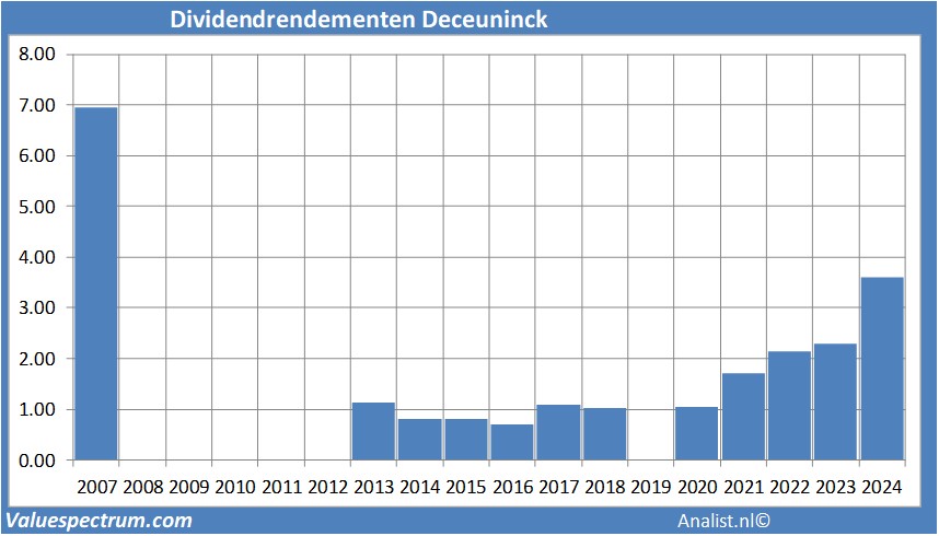 Beleggers in het aandeel Deceuninck kunnen waarschijnlijk rekenen op een behoorlijke dividenduitkering. Op basis van de laaatste analistentaxaties heeft het aandeel Deceuninck nu één van de top dividendrendementen van de Belgische beurs. Over het lopende jaar ligt de dividendbetalingconsensus op 9 cent. Deceuninck 's dividendrendement bedraagt dus 3.6 procent. Het gemiddelde dividendrendement van de industriele bedrijven ligt op een relatief aantrekkelijke 3.03 procent.