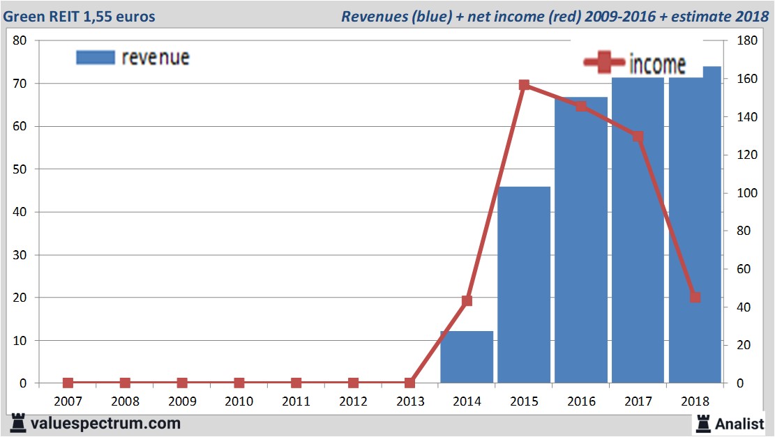Green REIT zal morgen haar resultaten over het voorbije kwartaal publiceren. Over het huidige boekjaar komt de omzet volgens de analisten uit op 73,93 miljoen euro. Dit is beperkt meer dan de omzet over 2017 toen de omzet 72,36 miljoen euro bedroeg.