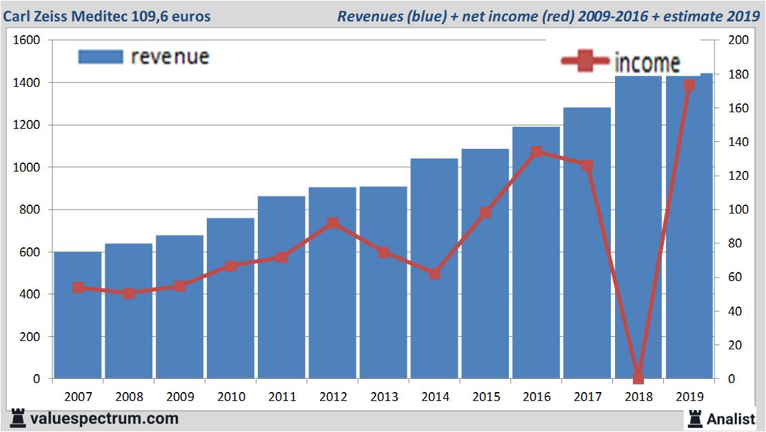 Morgen zal het Duitse Carl Zeiss Meditec met haar resultaten over het afgelopen kwartaal komen. Over het huidige boekjaar komt de omzet volgens de analisten uit op 1,44 miljard euro. Dit is licht minder dan de omzet over 2018 toen het bedrijf 1,46 miljard euro verdiende.