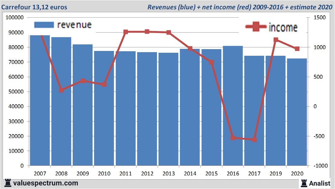 Morgen gaat Carrefour haar resultaten over het afgelopen kwartaal naar buiten brengen. Over 2020 komt de omzet volgens de analisten uit op 72,34 miljard euro. Dit is licht minder dan de omzet over 2019 toen het bedrijf 74,14 miljard euro verdiende.