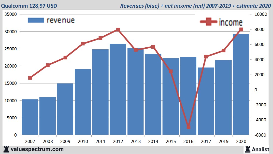 Op basis van het huidige aantal uitstaande aandelen bedraagt Qualcomm 's marktkapitalisatie 147,67 miljard dollar. Het aandeel Qualcomm was de afgelopen 12 maanden vrij bewegelijk. Sinds november vorig jaar staat het aandeel Qualcomm maar liefst 57 procent hoger. Het aandeel koerste het laatste jaar tussen de 58 en de 132 dollar.