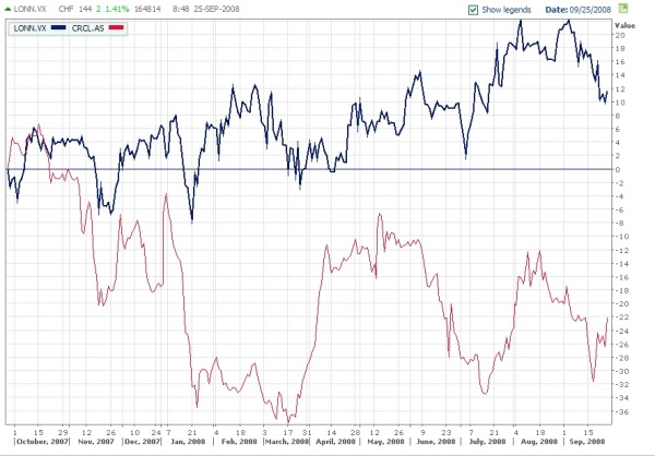 Lonza een positief rendement heeft behaald van 11,63%, waar Crucell een negatief rendement noteert van 22,17%. De grafiek toont aan dat de rendementen van beide aandelen in het afgelopen jaar (vanaf 26 september 2007) behoorlijk volatiel zijn geweest, maar dat er wel een trend waarneembaar was. Bij