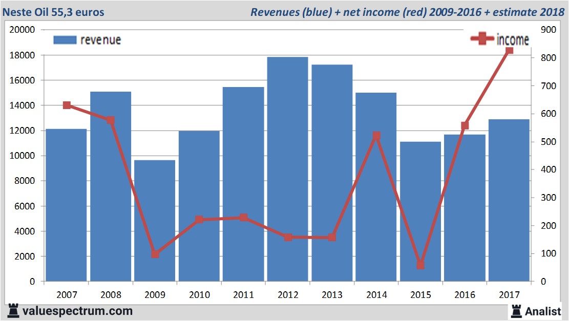 Neste Oil gaat morgen haar resultaten over het voorbije kwartaal uitbrengen. Over dit jaar komt de omzet volgens de analisten uit op 12,91 miljard euro. Dit is aanzienlijk meer dan de omzet over 2016 toen het bedrijf 11,69 miljard euro verdiende.