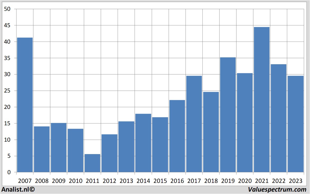 De analisten rekenen voor 2023 op een nettowinst van 26.93 miljard dollar. Voor dit jaar ligt de consensus van het resultaat per aandeel op een winst van 3.31 dollar. De koers-winst-verhouding ligt hiermee op 8.92.